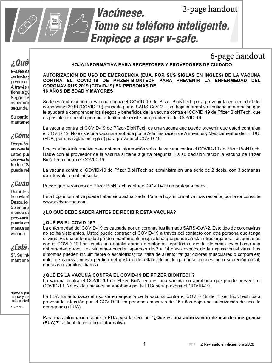 New 3/21; Spanish language versions of: COVID-19 Pfizer vaccine (F0310H) with v-safe handout (F0308H) package. Collated in sets, stapled. (F0311-H) (Not updated yet as were the English versions)
