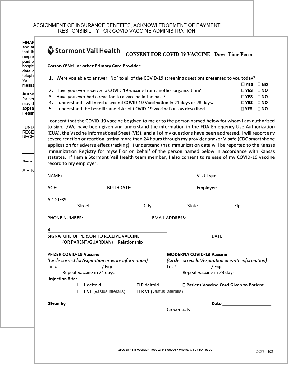 COVID19 Downtime forms pkg. Consent form F0302 and Assignment of Benefits F0303-4. (F0321)