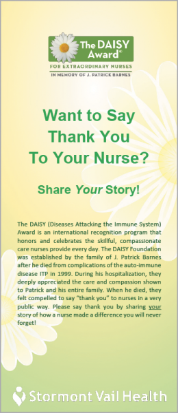 Daisy Award Nomination Form, 03/25. 2-sided, trifold. Full color. 80# Hammermill Color cover. F0038